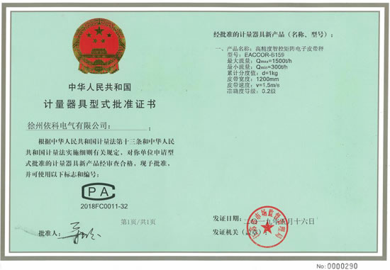 熱烈祝賀徐州依科電氣有限公司專(zhuān)利技術(shù)高精度智控矩陣電子皮帶秤EACCOR-B159獲得0國(guó)家0.2級(jí)計(jì)量證書(shū)CPA2018FC0011-32批準(zhǔn)證書(shū),配套高精度矩陣傳感器及矩陣智能稱重控制器(采用SEQ-AI智能算法,矩陣控制跟蹤復(fù)核技術(shù),...